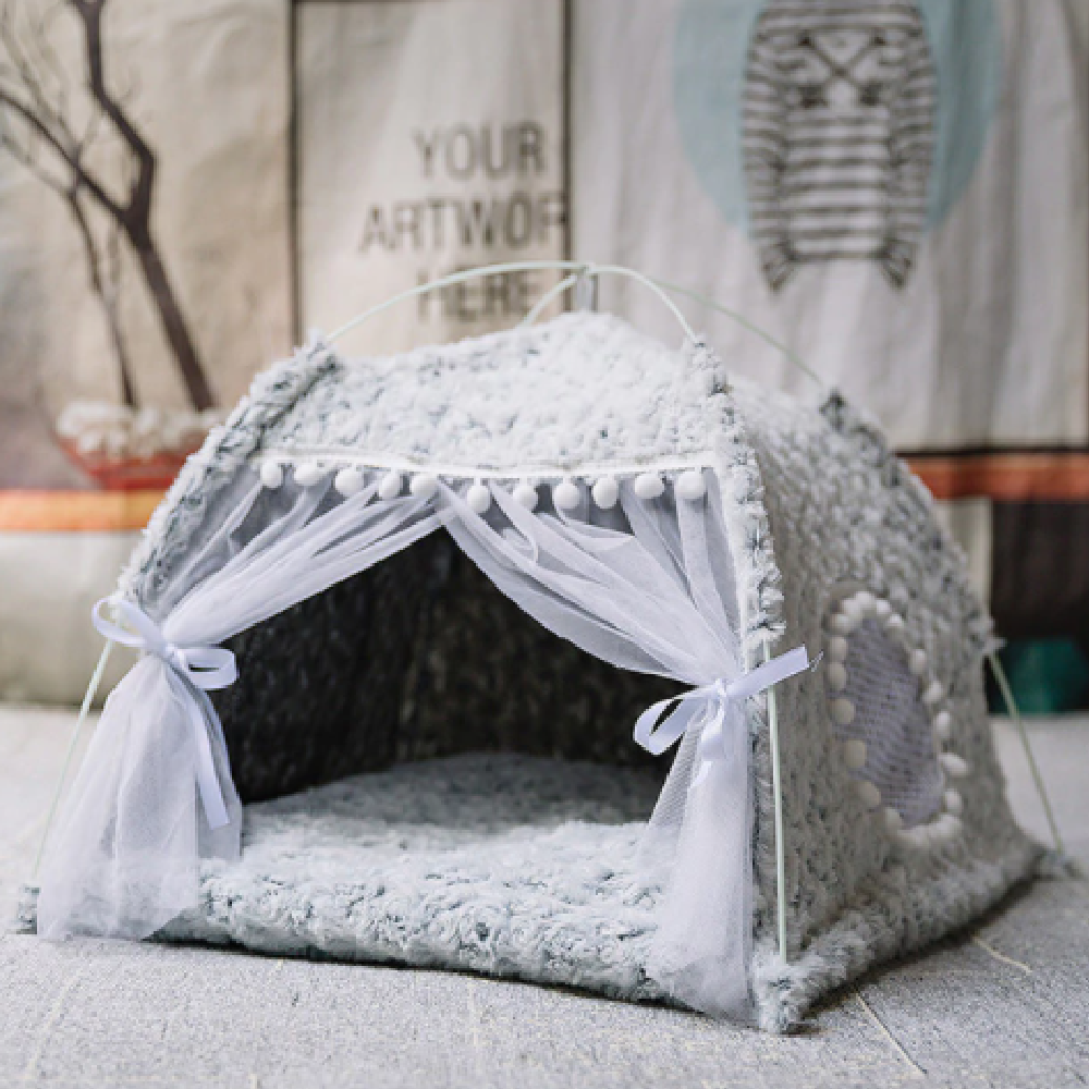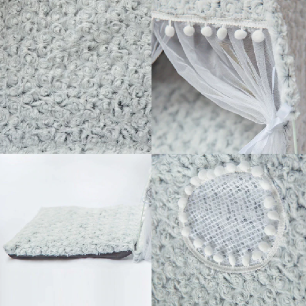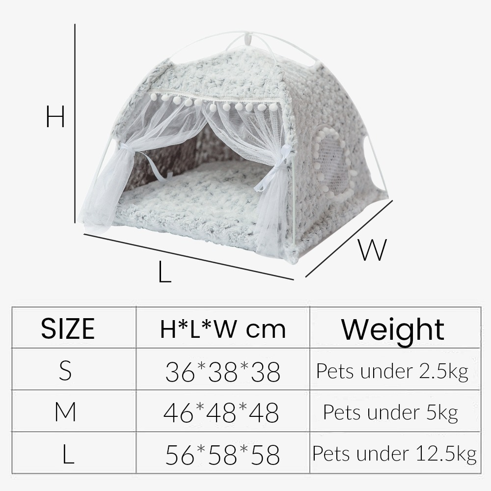 Our fancy tent is the ultimate retreat for your pet, and a great addition to any room in your home. Adorned with a rose pattern, pompoms, and mesh doorway. Soft and lightweight, its the perfect spot for all those naps your pet loves to take.