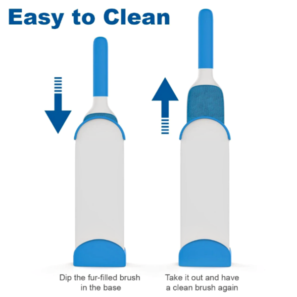 The perfect solution for removing pet fur and lint from clothing, furniture and car seats. Not only is our brush efficient but its also self cleaning. Simply dip the brush into the self cleaning base. The brush is double-sided, which provides 2X the cleaning power. Say goodbye to sticky lint rollers!