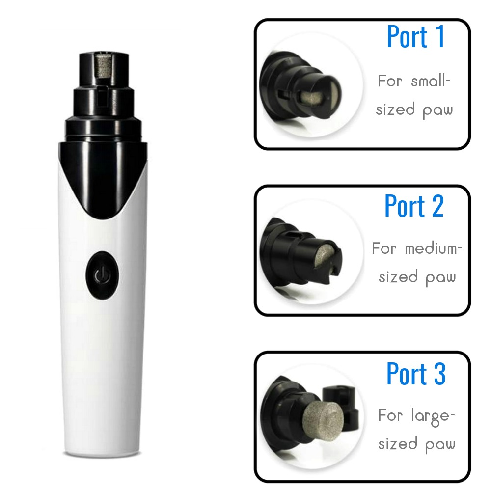 Get professional level pet grooming at home! This quiet and effective tool is perfect for more sensitive pets, or ones that simply don't enjoying nail trims with a traditional pet clipper. The grinder is designed with 3 ports for different sized paws, from the smallest to the largest. The nail grinder has a charge time of 2 hours, and lasts on average 3 hours working.