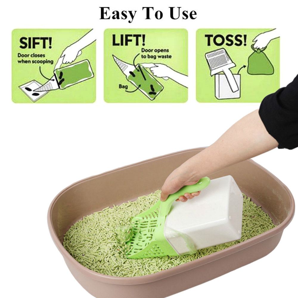 Our litter scoop comes with an attached waste bin, making the job of cleaning a litter box a whole lot easier. The trap door design keeps the mess contained, no more spilled litter! Simply detach the scoop from the waste bin, close the waste bag and throw it away.